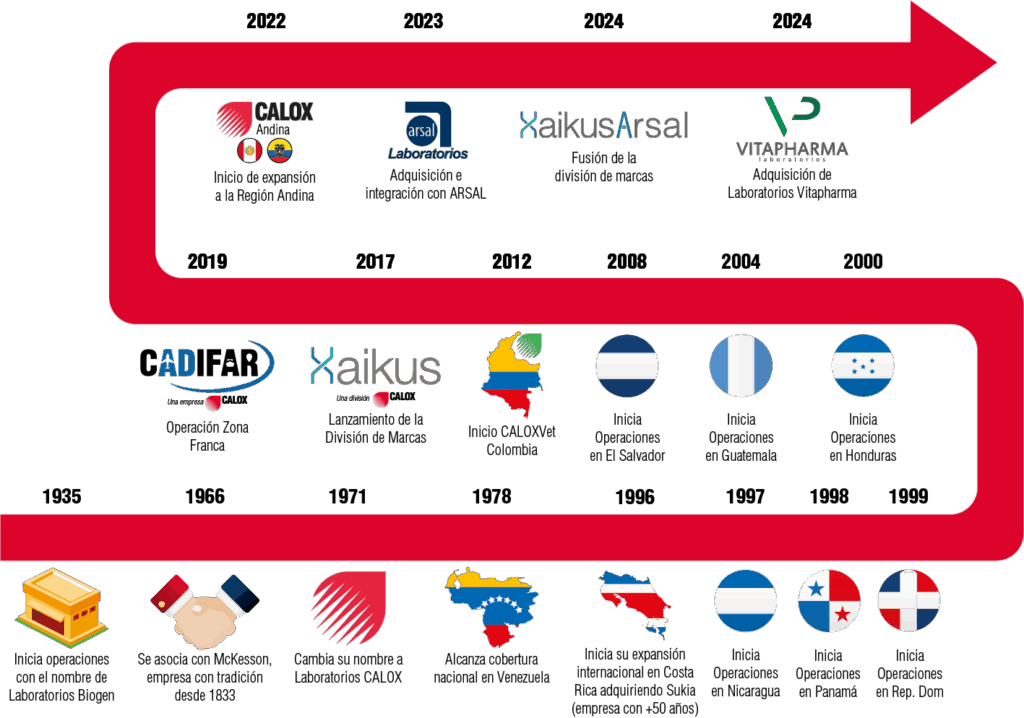 En 2023 Grupo CALOX compró Laboratorios Arsal en El Salvador y en el 2024 se hizo socio de Laboratorios Vitapharma en Perú.